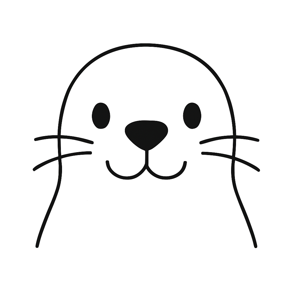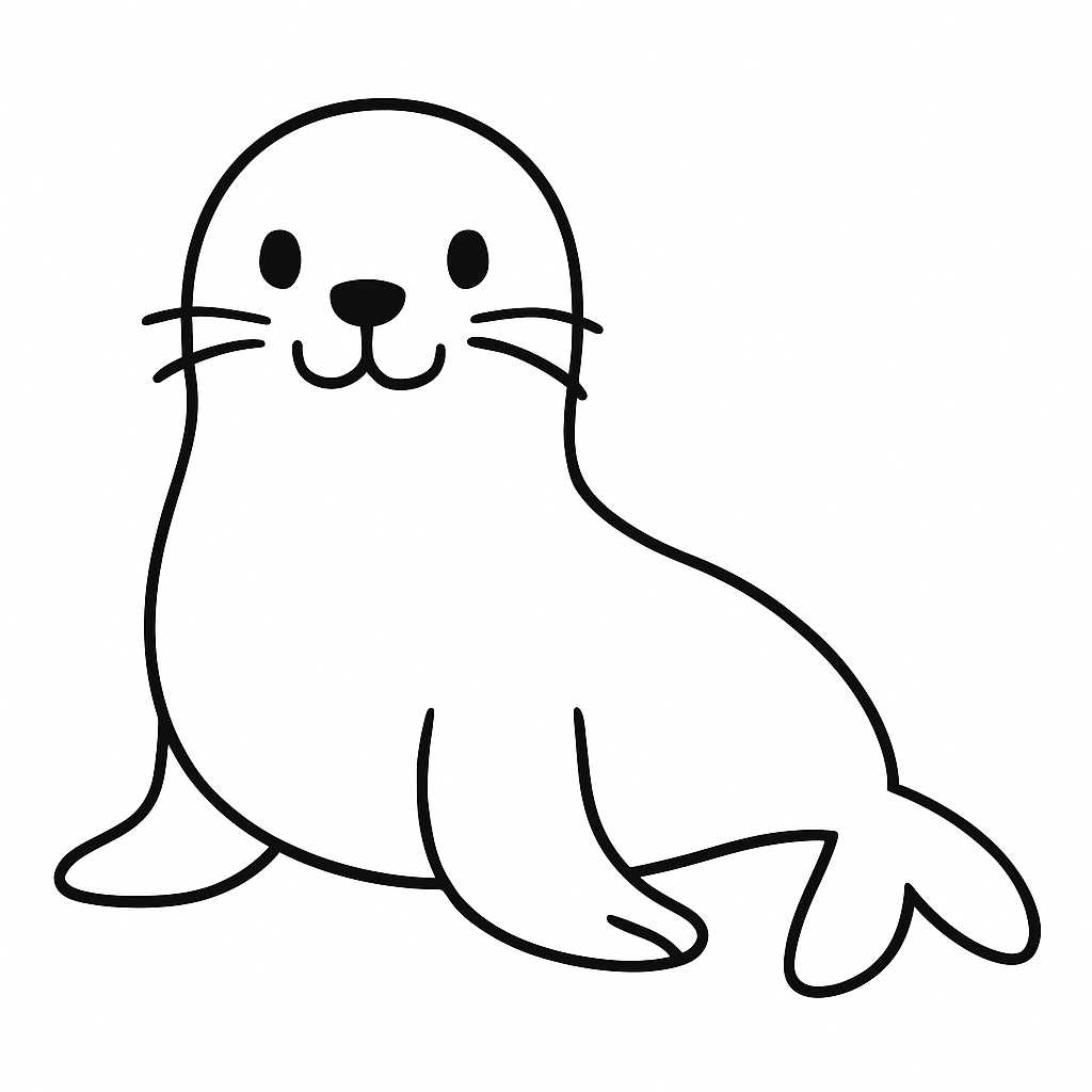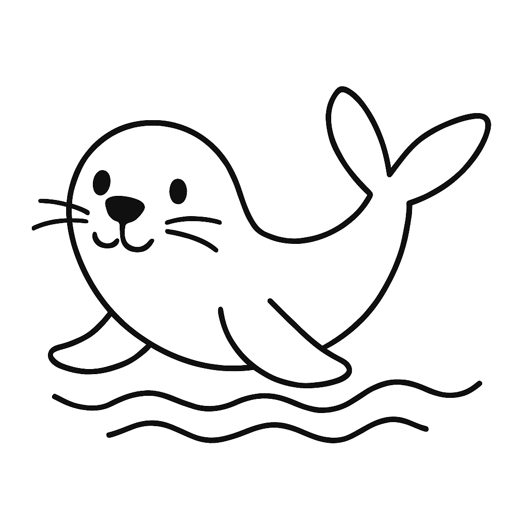 둥글고 유선형 몸, 짧은 지느러미, 얼굴에 큰 눈과 콧망울을 특징적으로 그리면 좋아요.