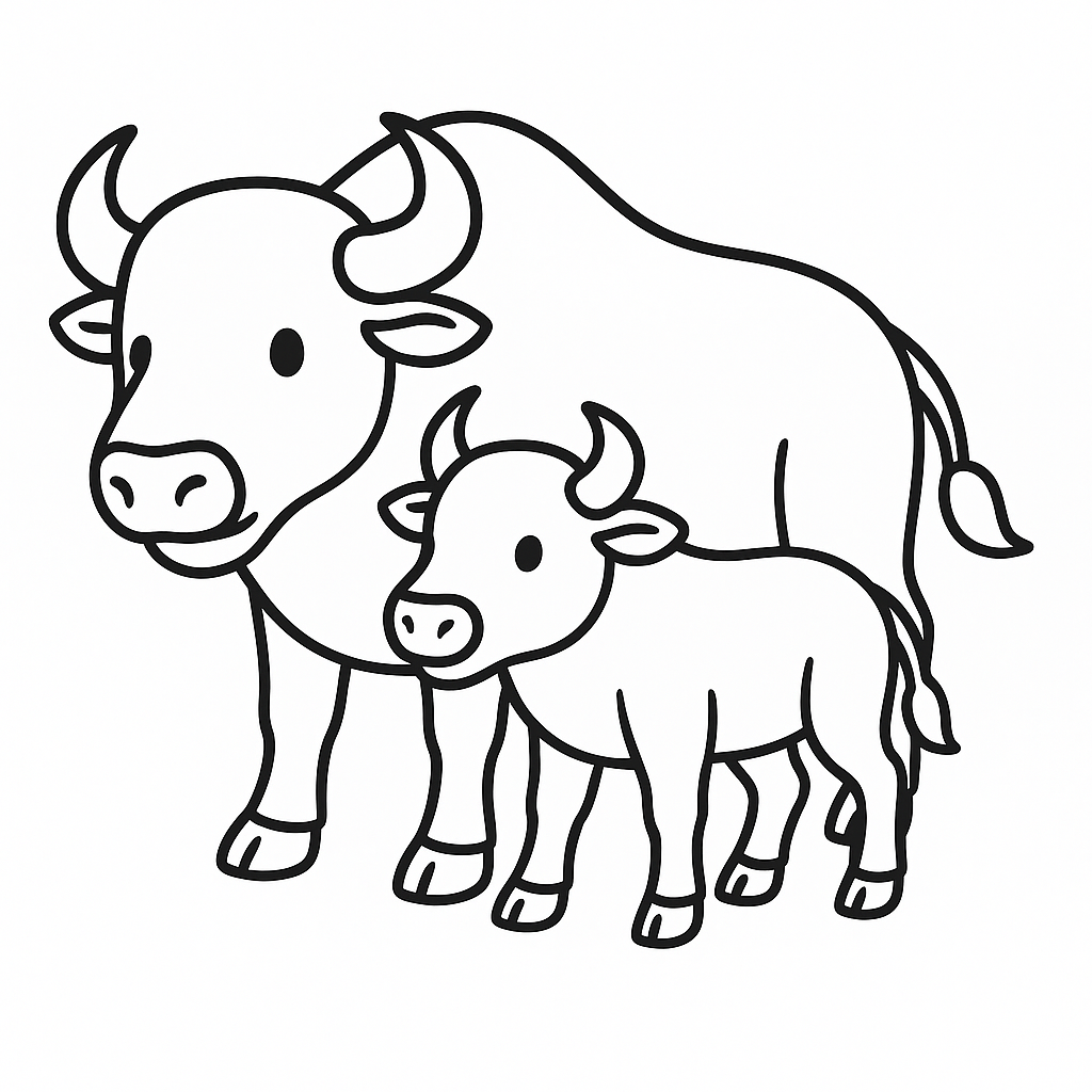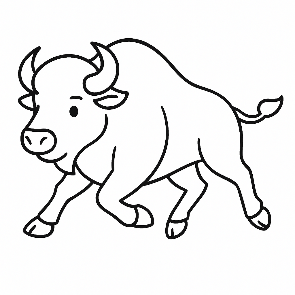 굵은 목, 둥근 몸통, 소의 뿔과 털을 단순화해서 풍부한 형상으로 그리면 재미있어요.