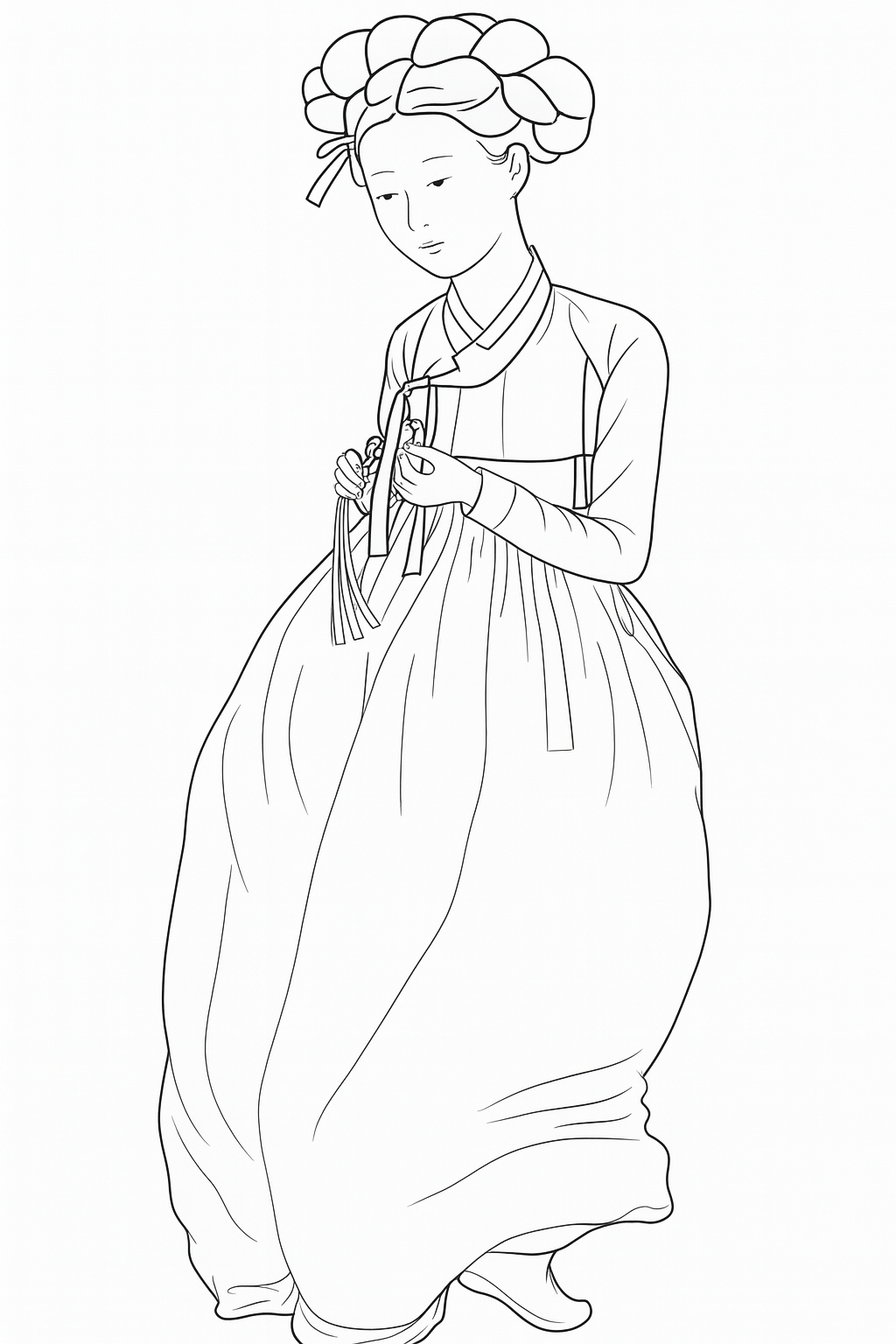 미인도 도안은 부드러운 선과 단정한 자세, 그리고 한복의 고운 곡선이 특징이에요. 단정히 묶은 머리, 자연스럽게 흐르는 옷자락, 부드러운 표정 등 섬세하게 표현된 요소가 많아서 아이들이 집중력 있게 색칠하며 관찰력을 기를 수 있어요. 색깔은 전통 한복의 고운 색들을 써보면 좋아요—연분홍, 연두, 하늘색 등 부드럽고 따뜻한 색상들이 잘 어울려요.